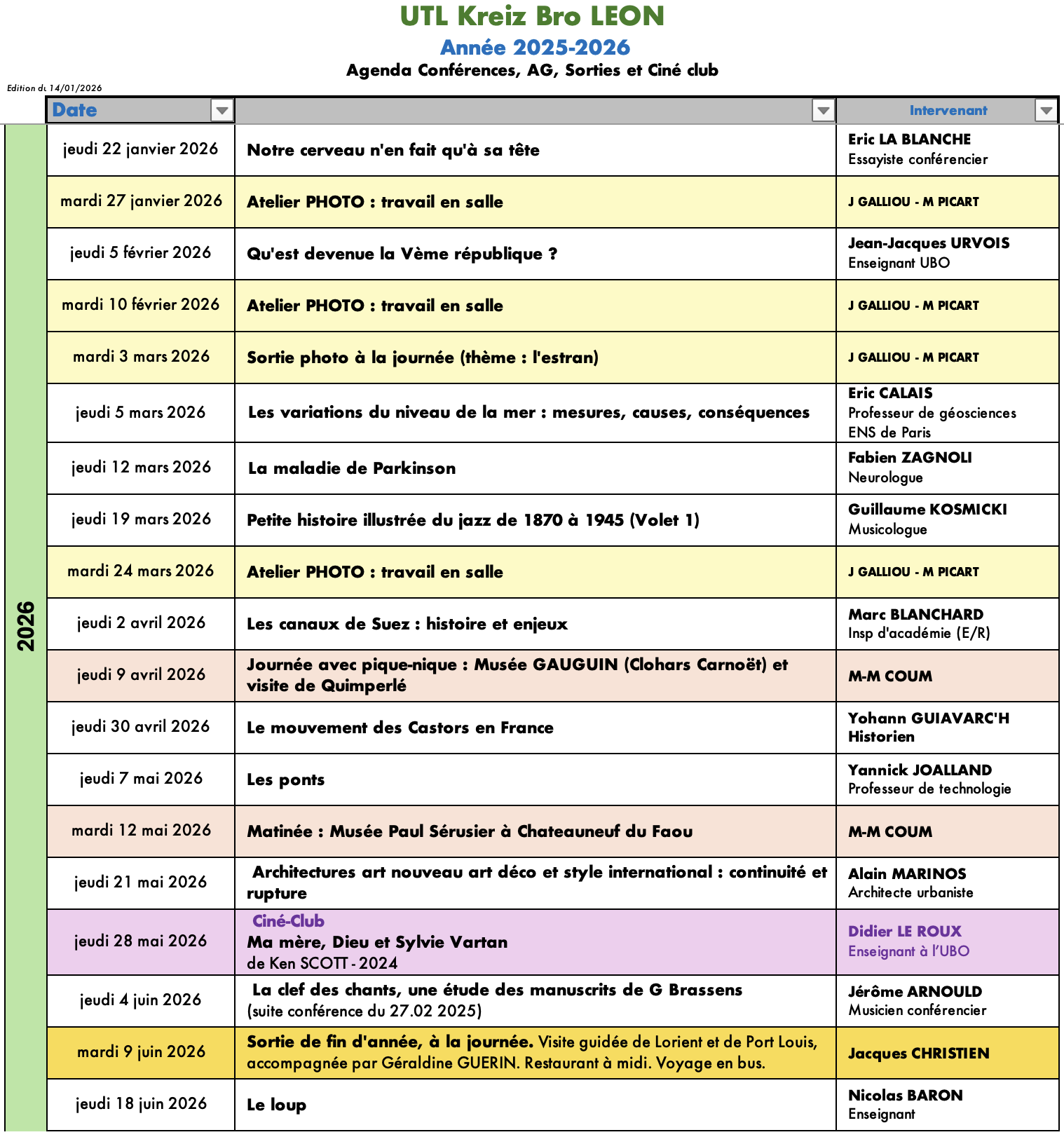 Agenda des activités 2025-206 de l'UTL de Lesneven.