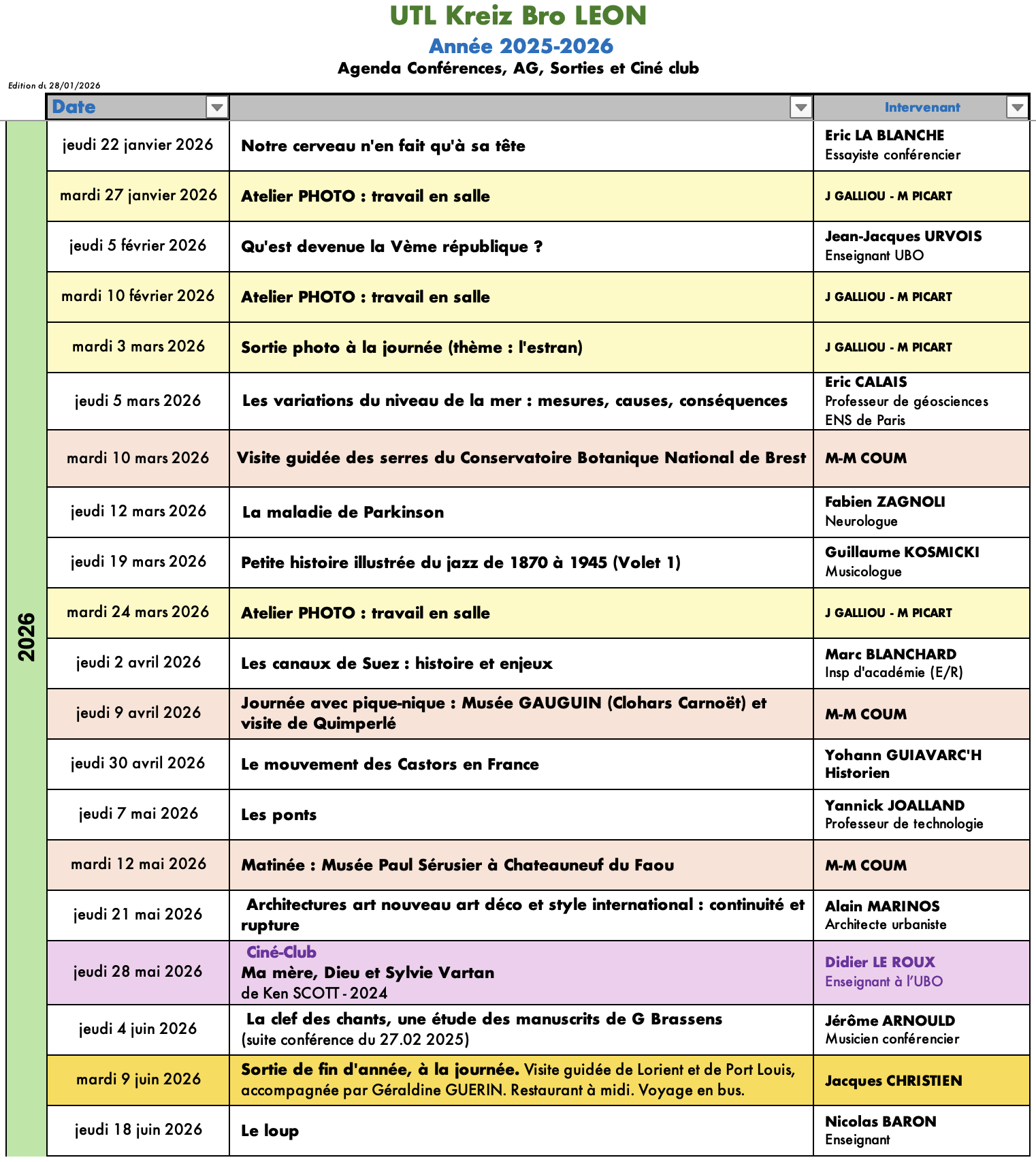 Agenda des activités 2025-206 de l'UTL de Lesneven.